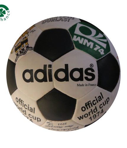 The ball used for the 1970 and 1974 World Cup was the Telstar, design by Adidas. It was the first white football ever to be painted with black pentagons which became synonymous with football throughout the world. The distinct 32 white and black leather panels that comprised the Telstar made it the roundest ball of its time.